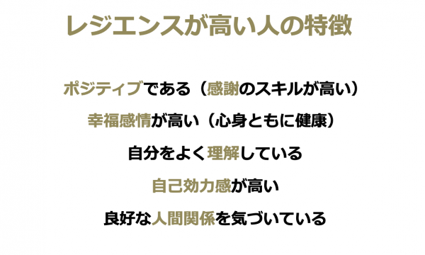 レジリエンスが高い人には共通点があります。この共通点を押さえて、そのポイントを高めることでレジリエンスは高まるということになりますね。